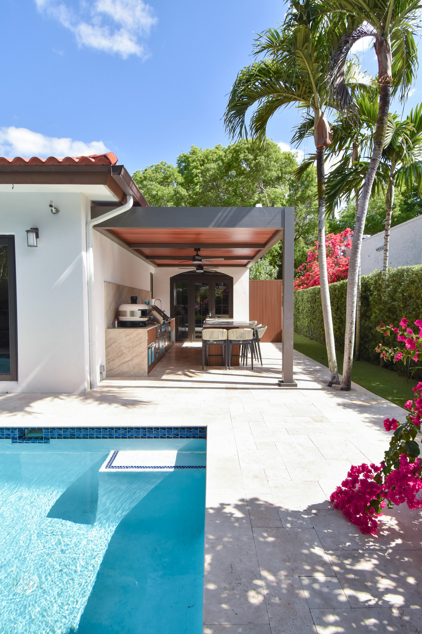 Luxurious backyard transformation with custom pergola and outdoor entertainment area.