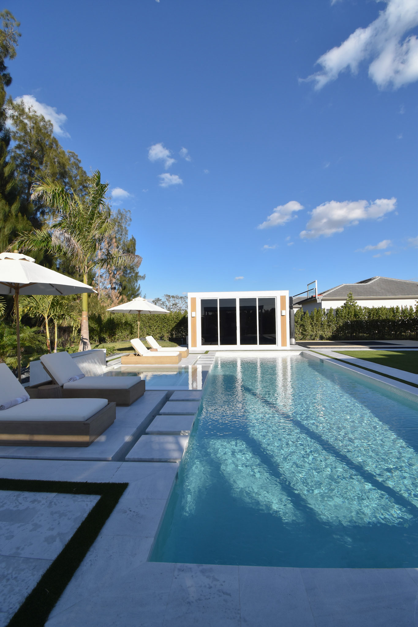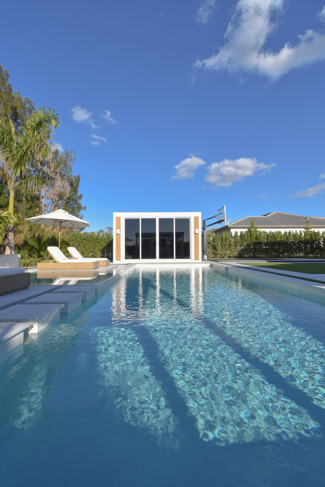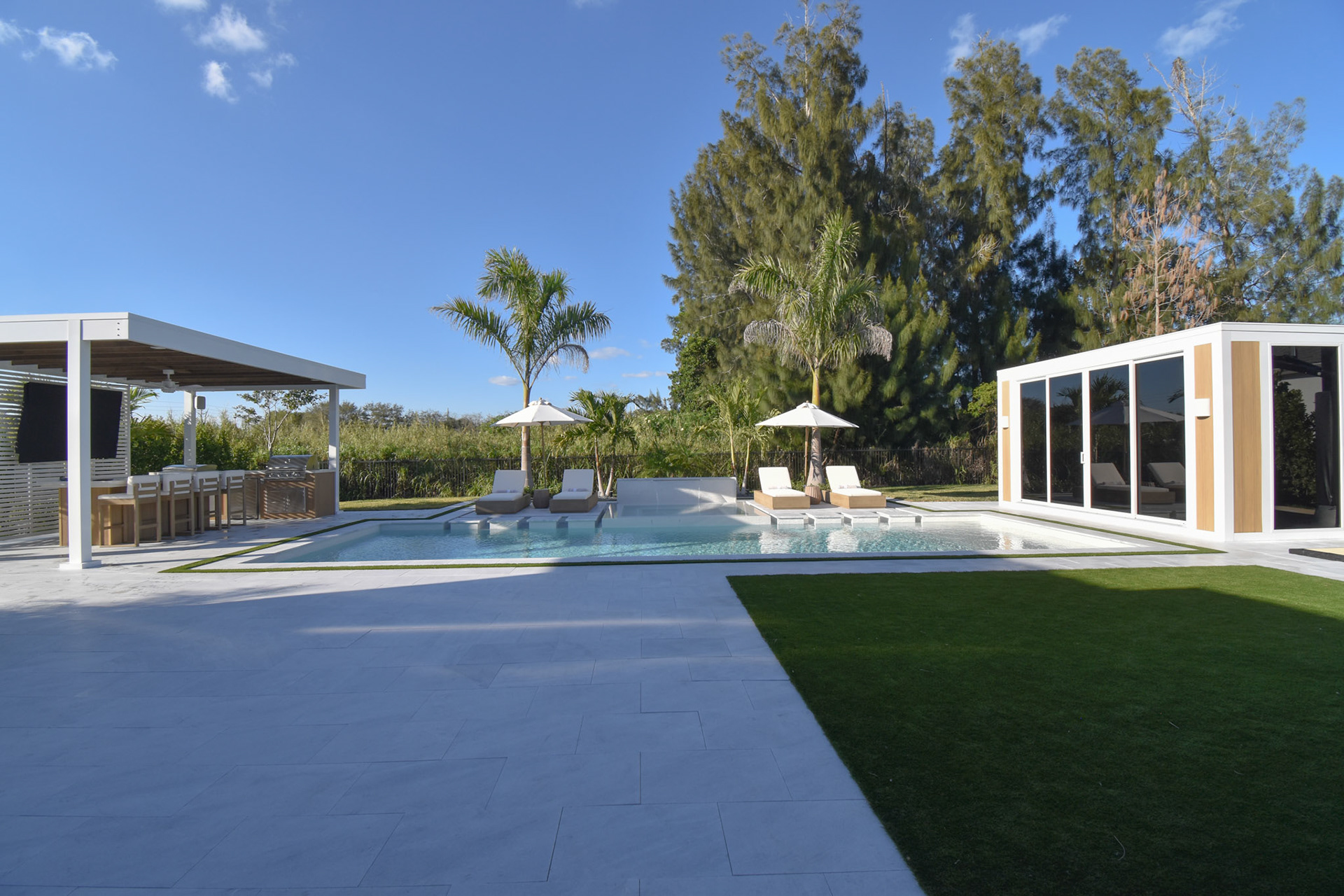 Luxury outdoor living space with R-Series pergola, composite decking, and landscape design.