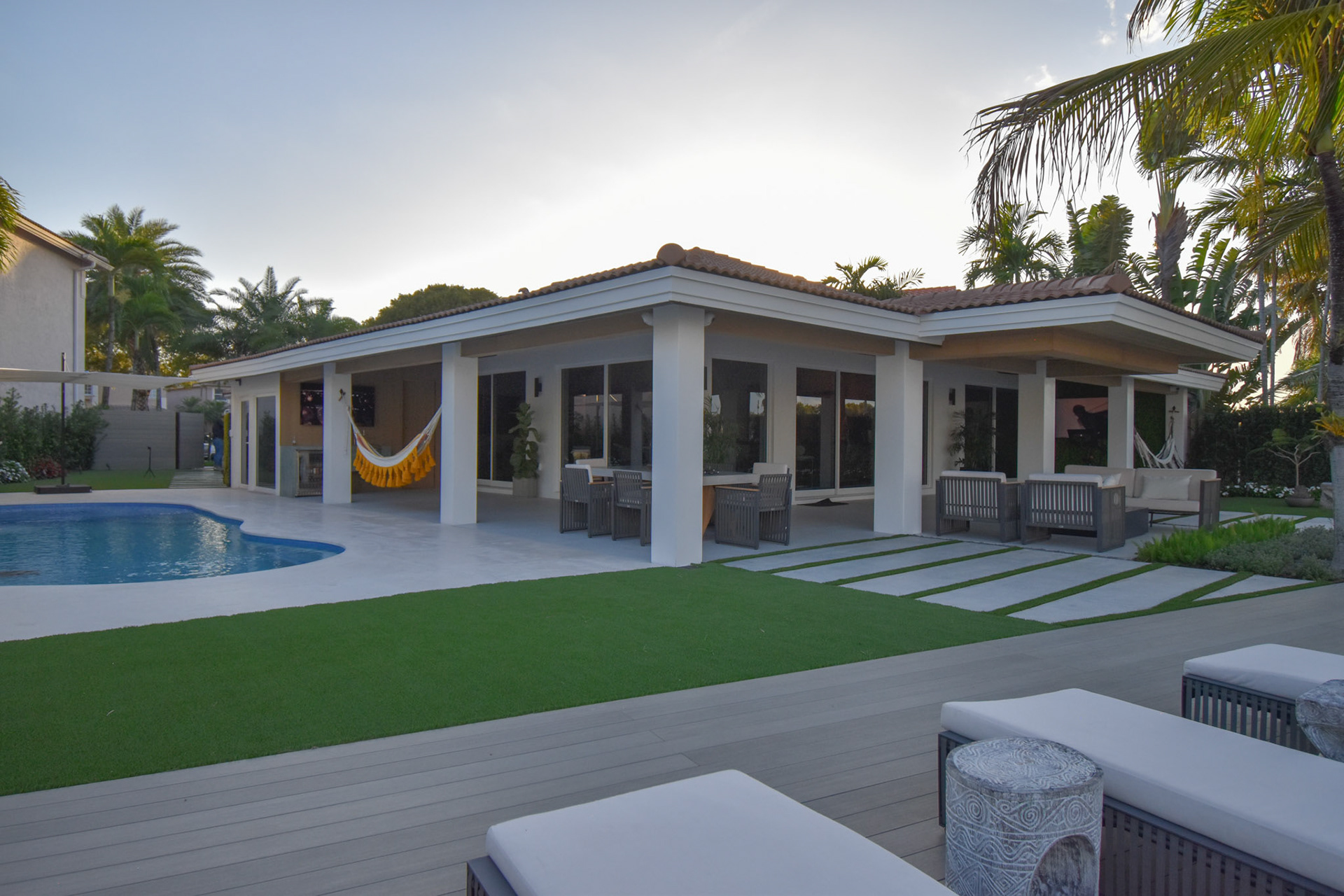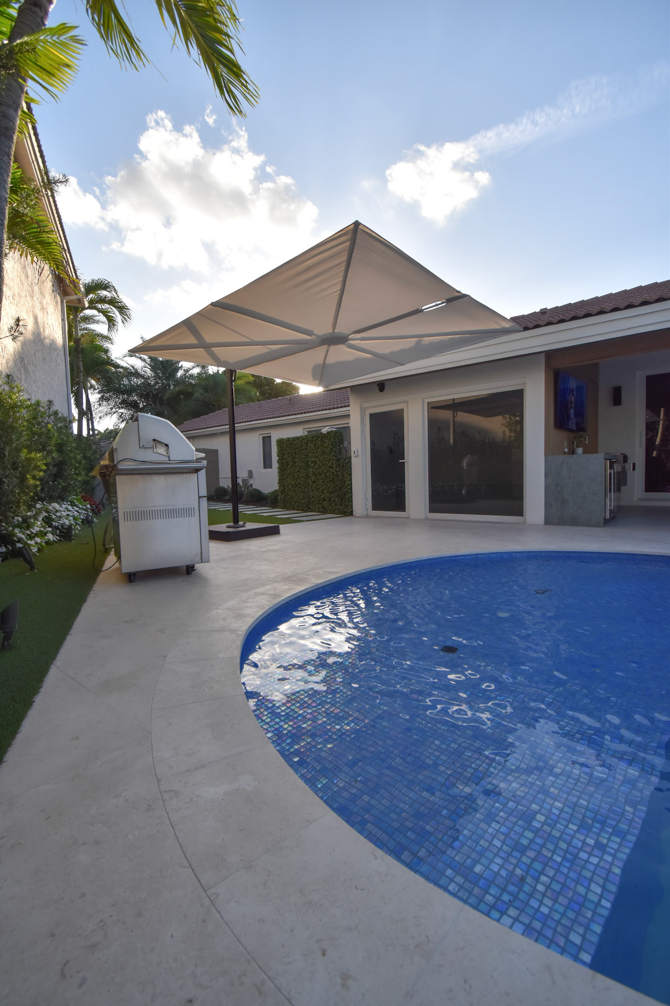 Full backyard design and build with pergola, outdoor kitchen, and pool area.