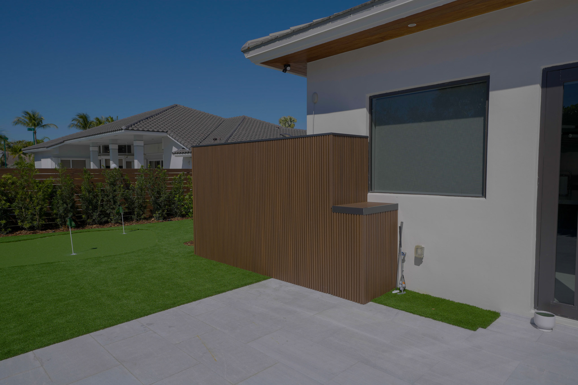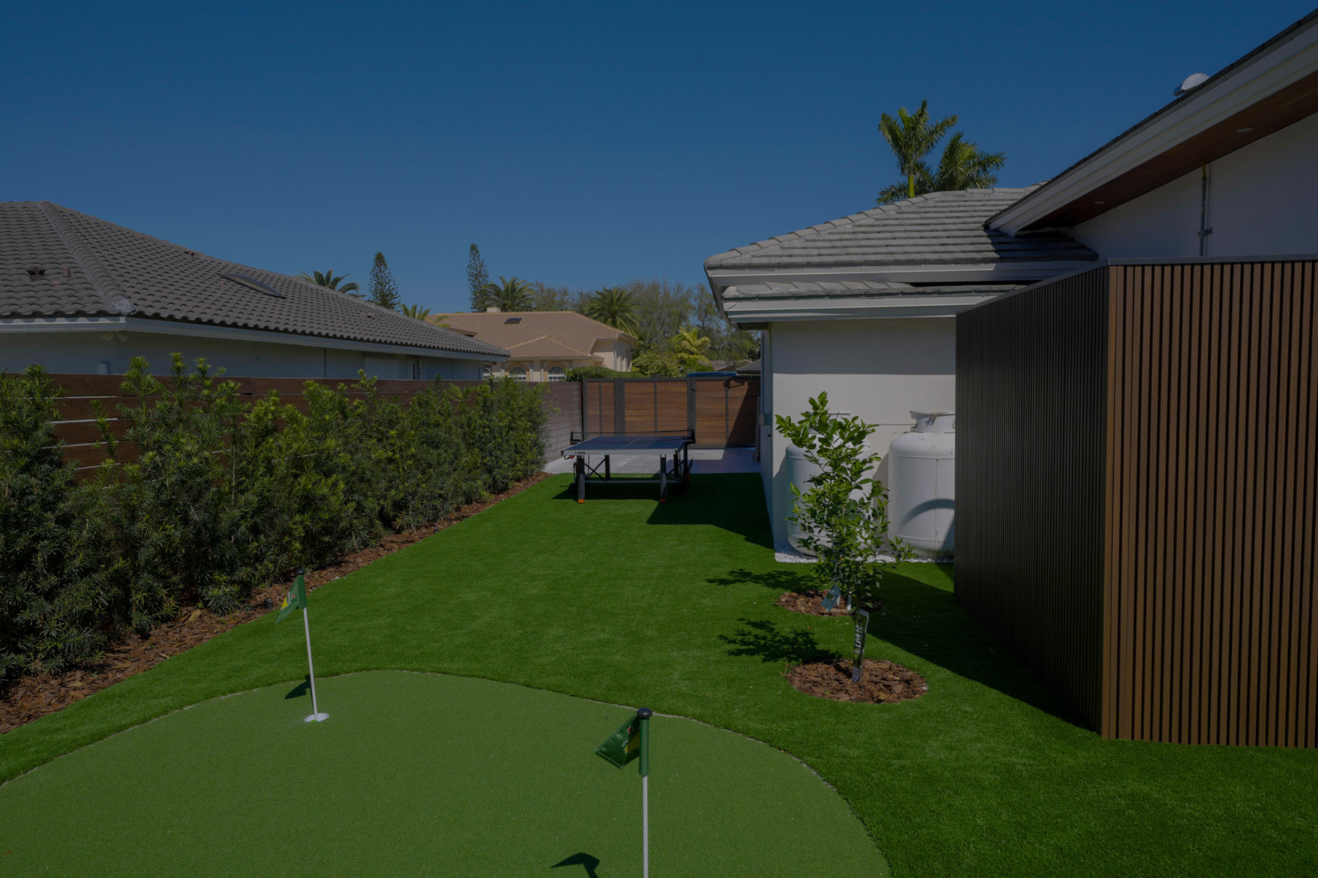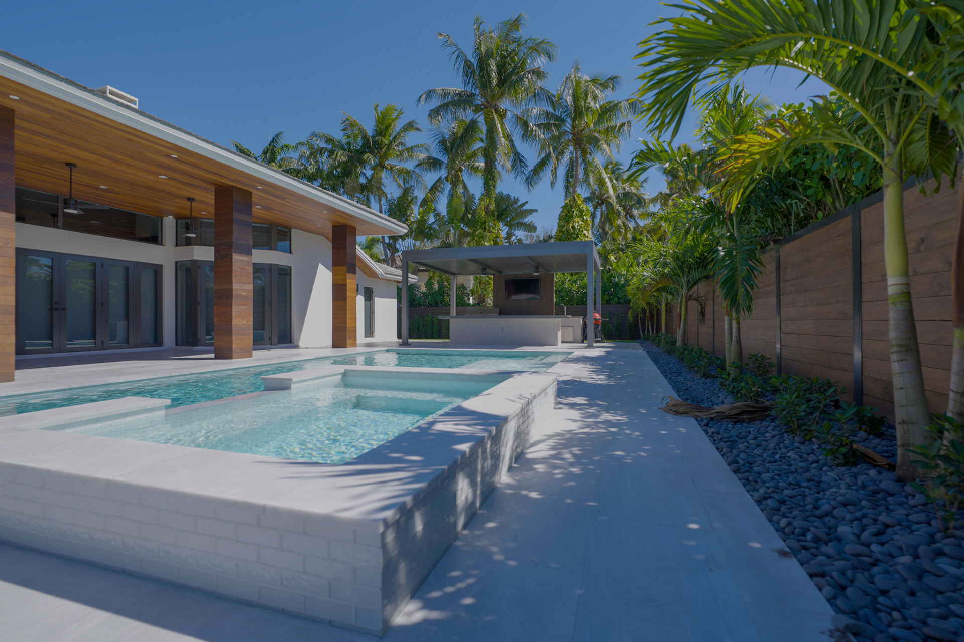 Tranquil outdoor retreat with pergola and lush landscaping.