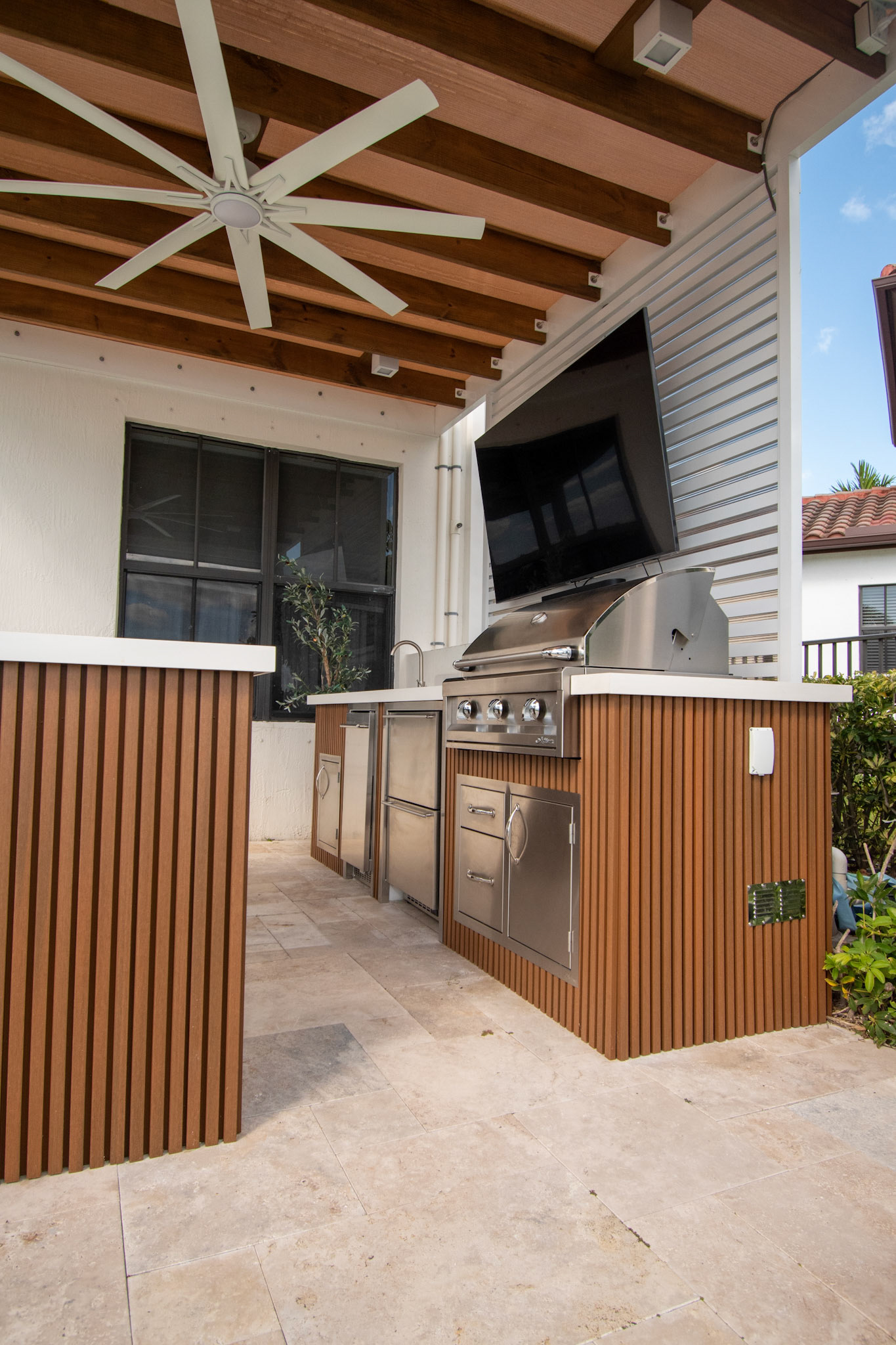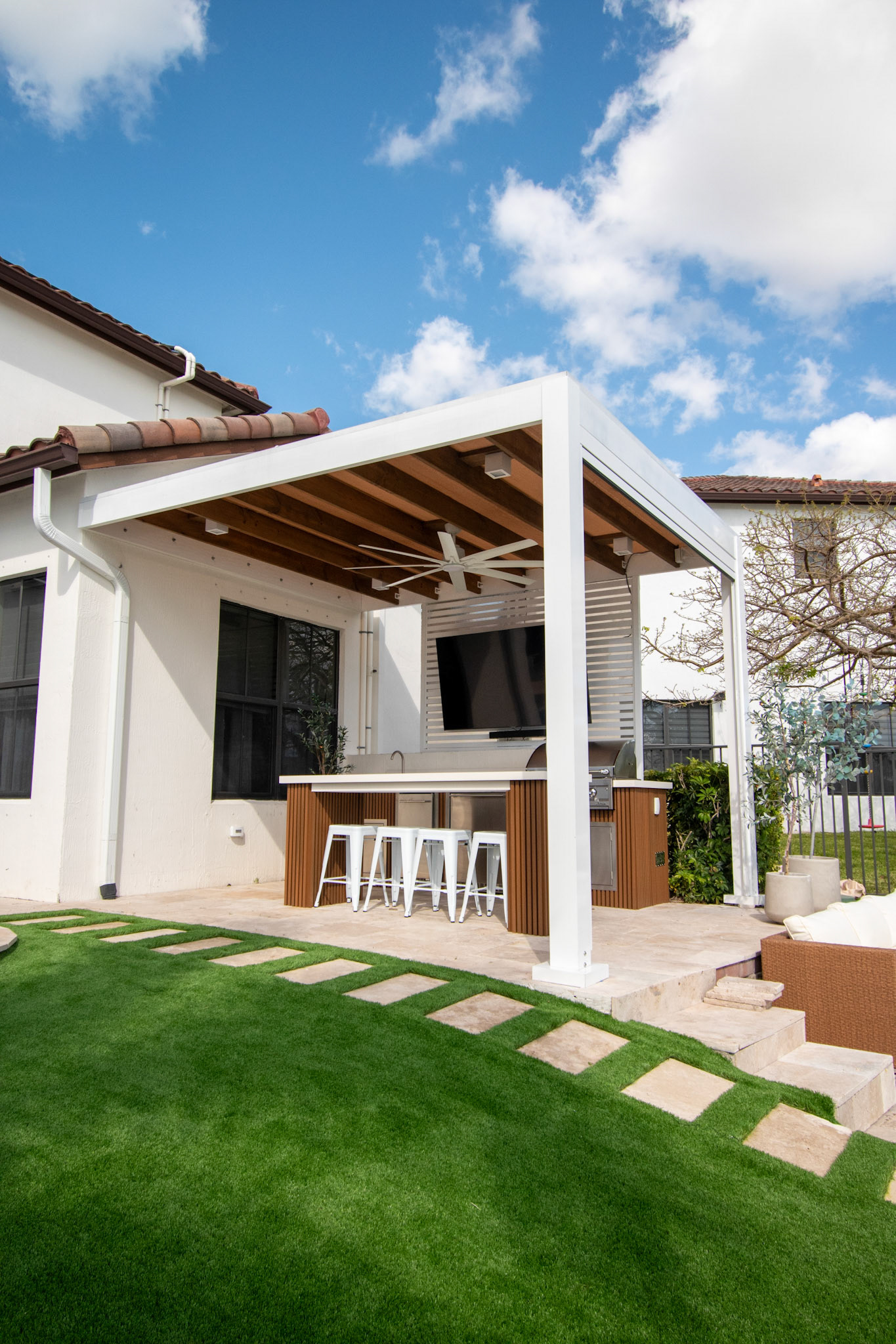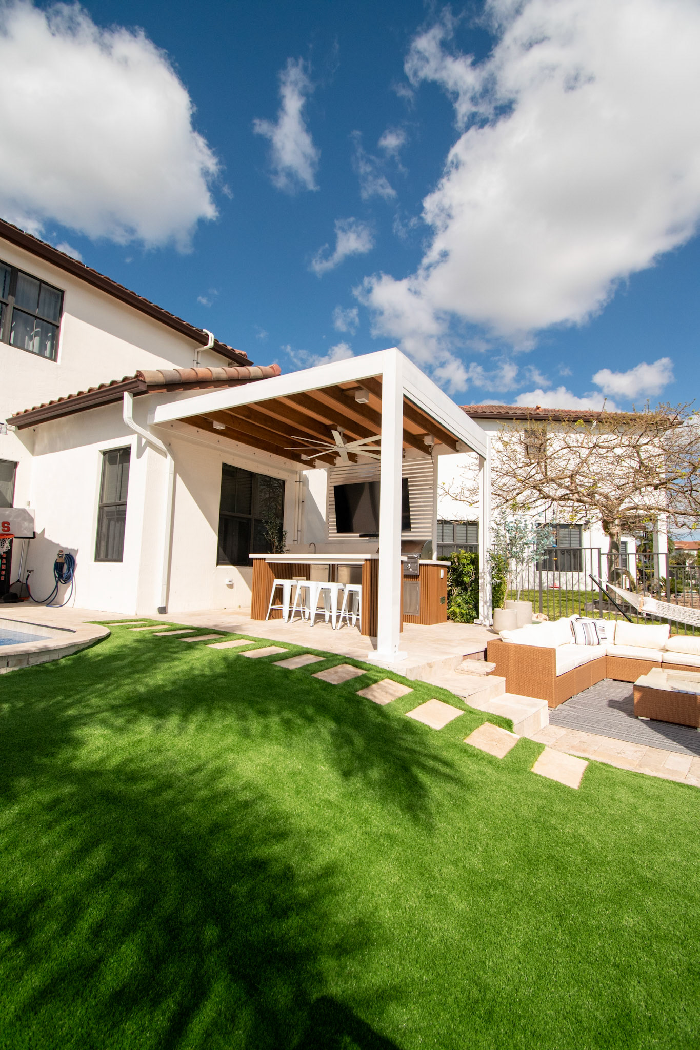 Complete backyard overhaul with pergola, kitchen, and pool area.
